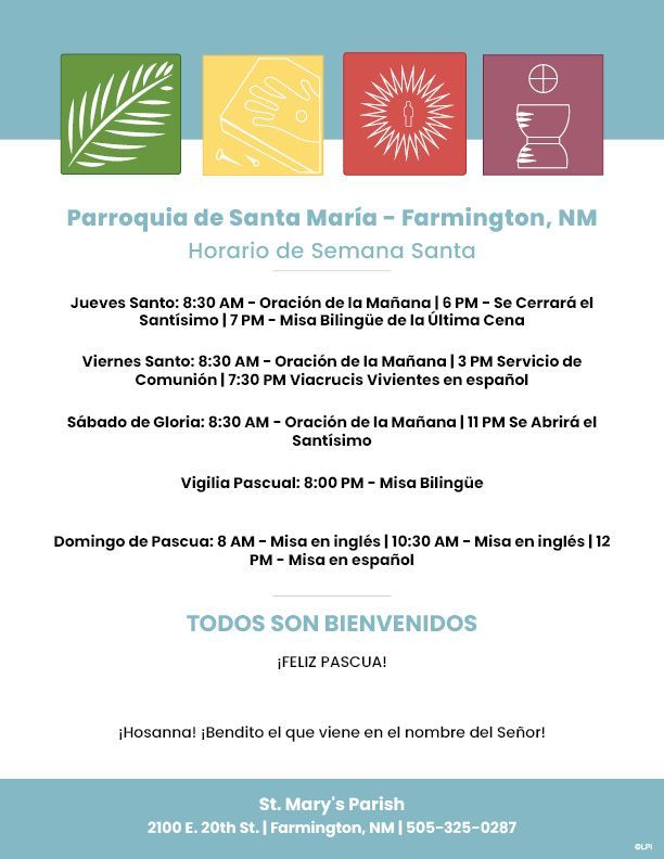 Nosotros los Católicos de Santa María damos gloria a Dios, atreves de la oración, los Sacramentos, y nuestras vidas diarias. Nos empoderamos uno a otro para amar a Jesucristo y ministramos en las necesidades espirituales y comunales de todos. Que se haga la voluntad de Dios.