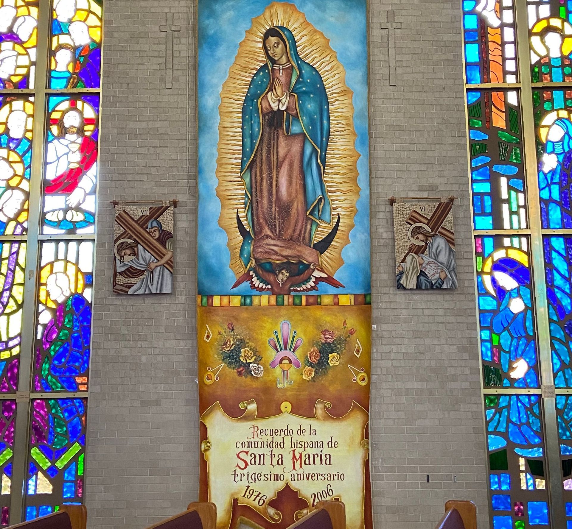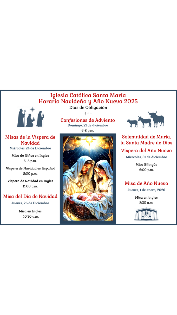 Nosotros los Católicos de Santa María damos gloria a Dios, atreves de la oración, los Sacramentos, y nuestras vidas diarias. Nos empoderamos uno a otro para amar a Jesucristo y ministramos en las necesidades espirituales y comunales de todos. Que se haga la voluntad de Dios.