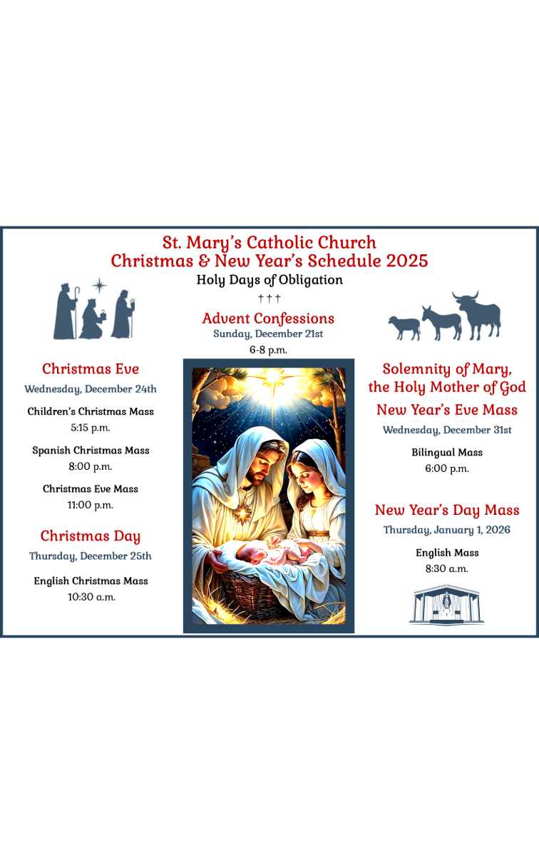 We the Catholics of St. Mary’s give glory to God, through prayer, the Sacraments, and our daily lives. We empower each other to love Jesus Christ and minister to the spiritual and communal needs of all. God’s will be done.